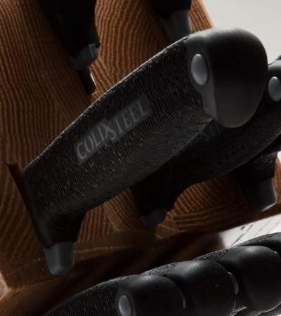 The Kitchen Classics Set of 13 from Cold Steel. Don’t let the word kitchen fool you into thinking Cold Steel has gone soft. Just the opposite. Cold Steel is dedicated to knife innovation and providing the strongest, sharpest knives in the world. This dedication has translated over to their kitchen knives. The blades are made out of German 4116 Cryo Quenched Stainless Steel. The blades feature a precision flat ground and are honed razor sharp by hand. Each handle features a stiff Zytel core inside with a softer, checkered Kraton exterior. This combination ensures a strong, durable handle, but at the same tough offers a comfortable, non-slip grip- great for any kitchen task!
